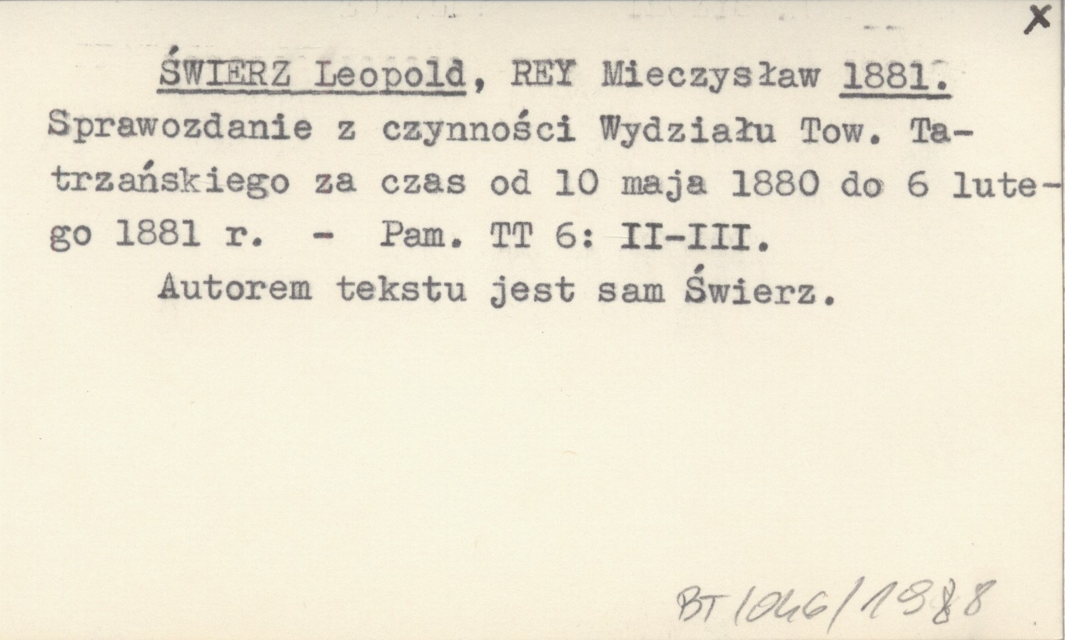 ŚWIERZ Leopold REY, Mieczysław. ; 1881 Sprawozdanie z czynności Wydziału Tow. Tatrzańskiego za czas od 10 maja 1880 do 6 lutego 1881 r.