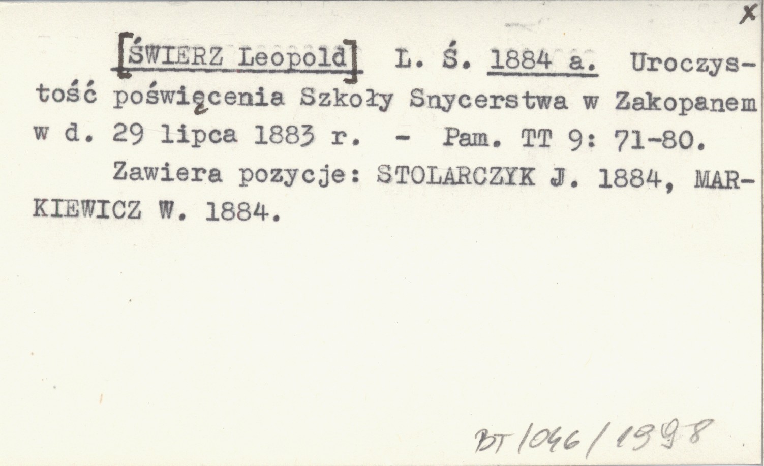 L. Ś. [ŚWIERZ Leopold] 1884 a Uroczystość poświęcenia Szkoły Snycerstwa w Zakopanem w d. 29 lipca 1883 r.