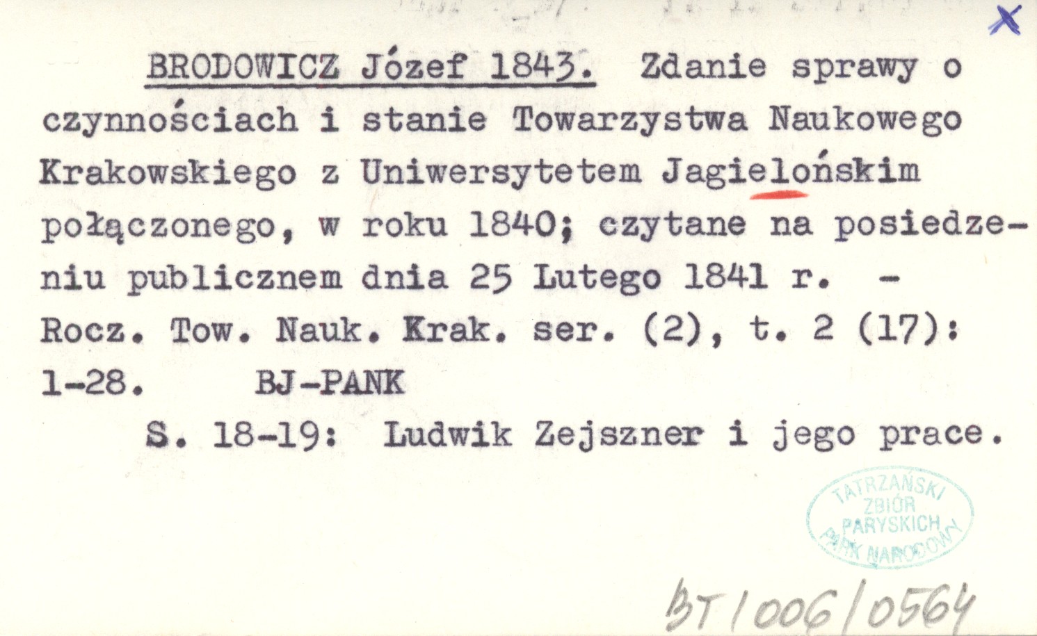 BRODOWICZ Józef 1843 Zdanie sprawy o czynnościach i stanie Towarzystwa Naukowego Krakowskiego z Uniwersytetem Jagielońskim połączonego, w roku 1840 ; czytane na posiedzeniu publicznem dnia 25 lutego 1841 r.