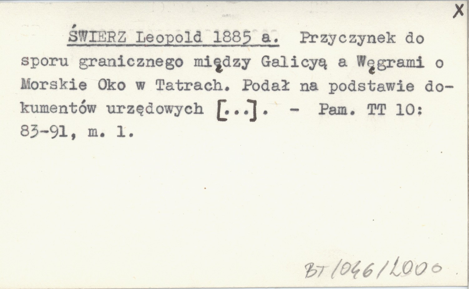 ŚWIERZ Leopold 1885 a Przyczynek do sporu granicznego między Galicyą a Węgrami o Morskie Oko w Tatrach. Podał na podstawie dokumentów urzędowych [...].