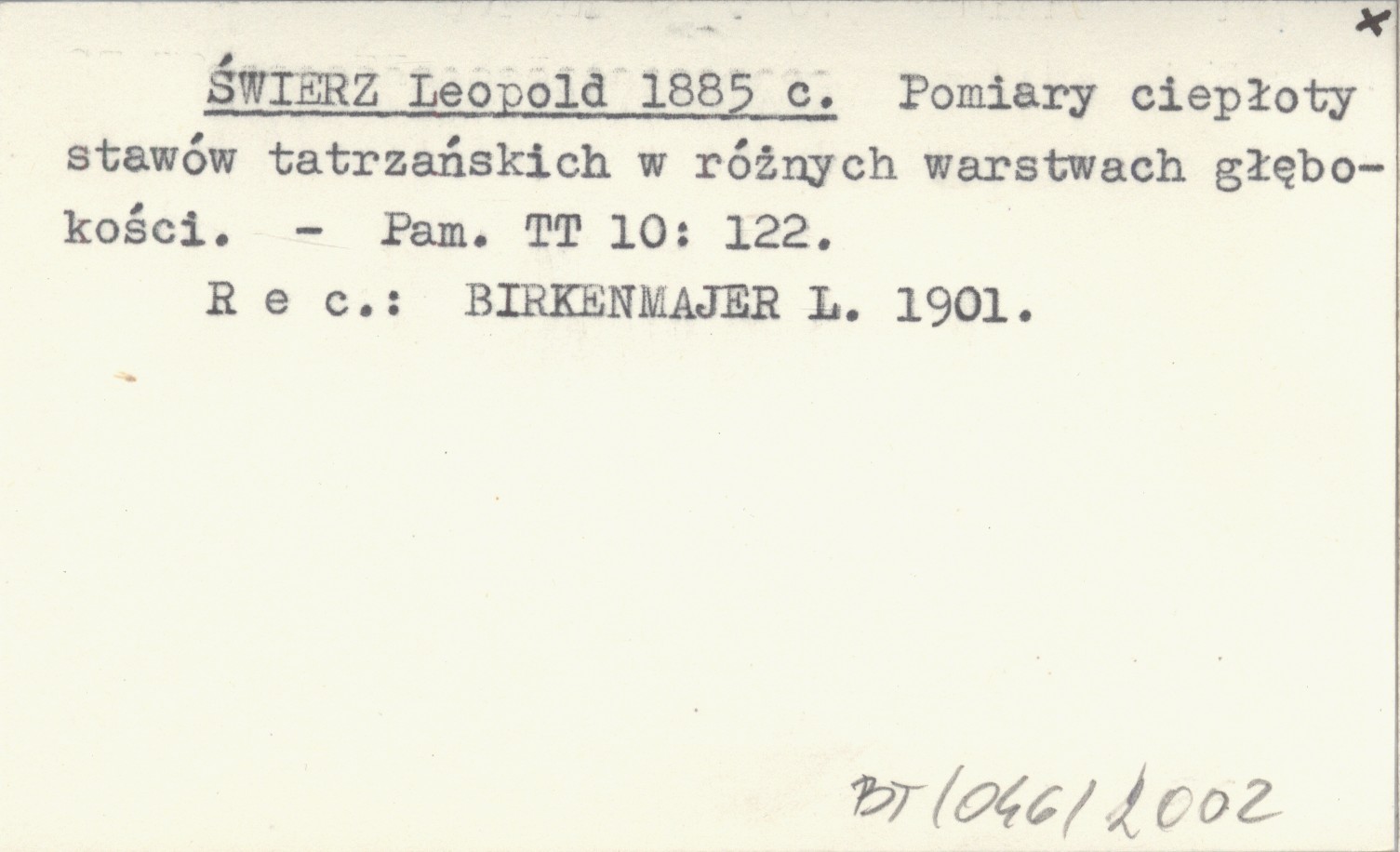 ŚWIERZ Leopold 1885 c Pomiary ciepłoty stawów tatrzańskich w różnych warstwach głębokości.