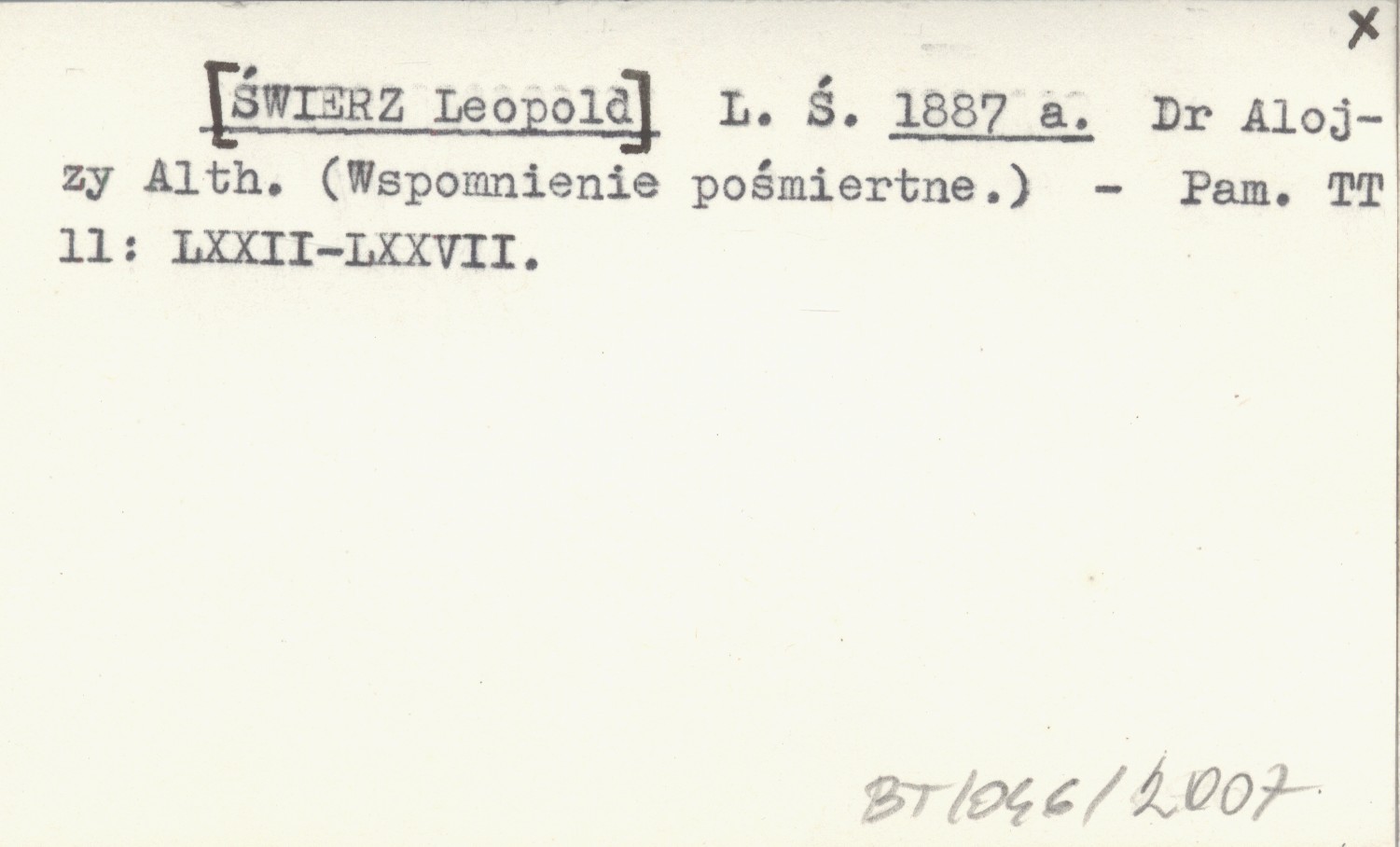 L. Ś. [ŚWIERZ Leopold] 1887 a Dr Alojzy Alth. (Wspomnienie pośmiertne).