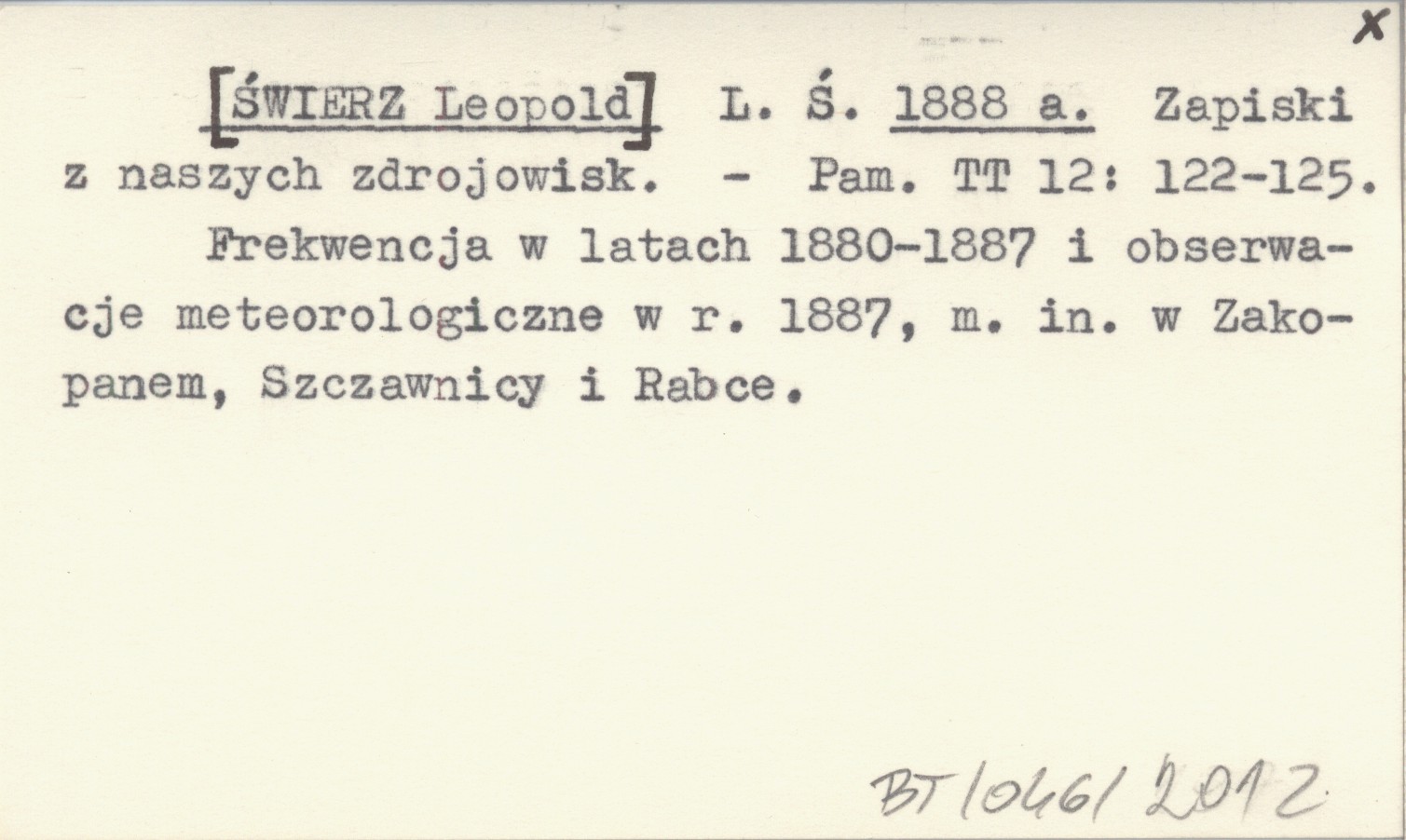 Pamiętnik Towarzystwa Tatrzańskiego, 12: 122-125. Frekwencja w latach 1880-1887 i obserwacje meteorologiczne w r. 1887, m. in. w Zakopanem, Szczawnicy i Rabce.