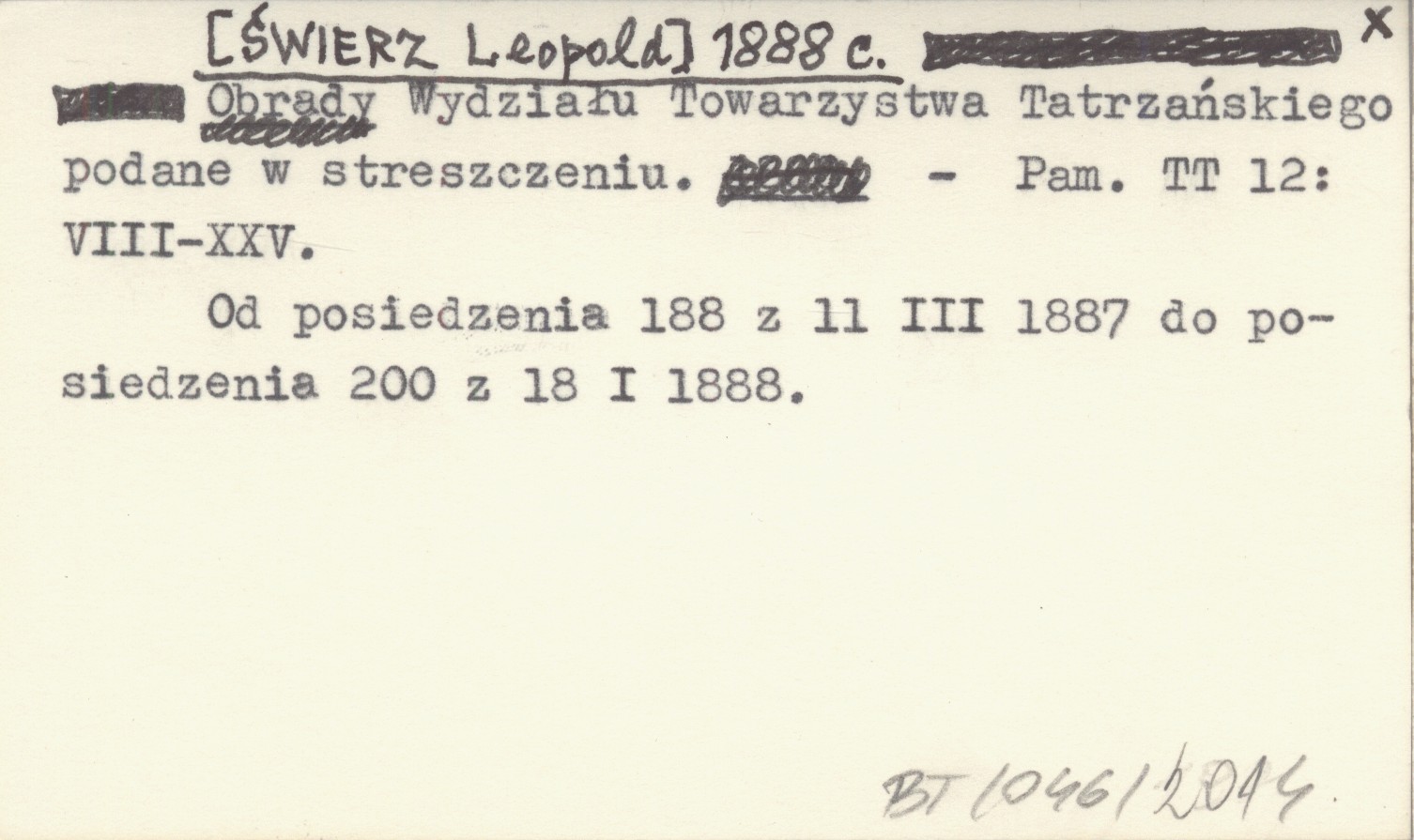 [ŚWIERZ Leopold] 1888 c Obrady Wydziału Towarzystwa Tatrzańskiego podane w streszczeniu.
