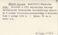ŚWIERZ Leopold MARKIEWICZ, Władysław. ; 1891 Protokół z XVII zwyczajnego walnego Zgromadzenia Towarzystwa Tatrzańskiego, odbytego w muzeum techniczno-przemysłowem w Krakowie dnia 2 lutego 1890 r.