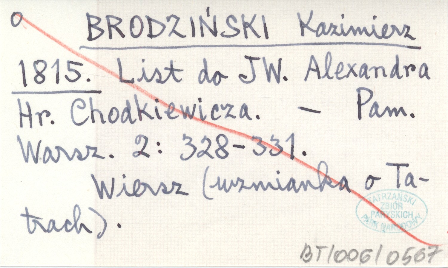 BRODZIŃSKI Kazimierz 1815 List do JW. Alexandra Hr. Chodkiewicza.