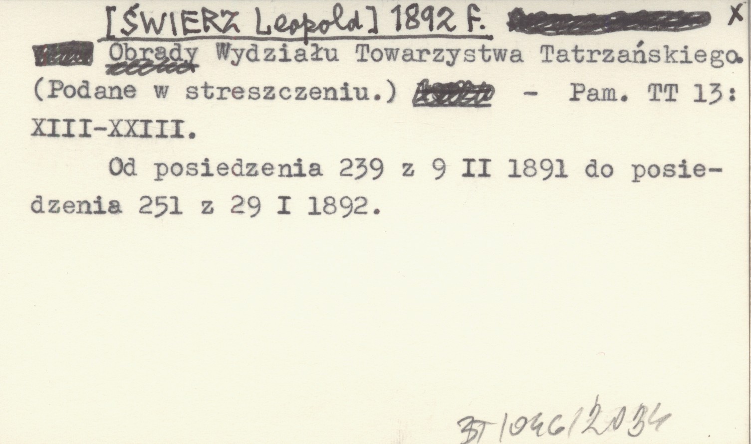 [ŚWIERZ Leopold] 1892 f Obrady Wydziału Towarzystwa Tatrzańskiego. (Podane w streszczeniu).