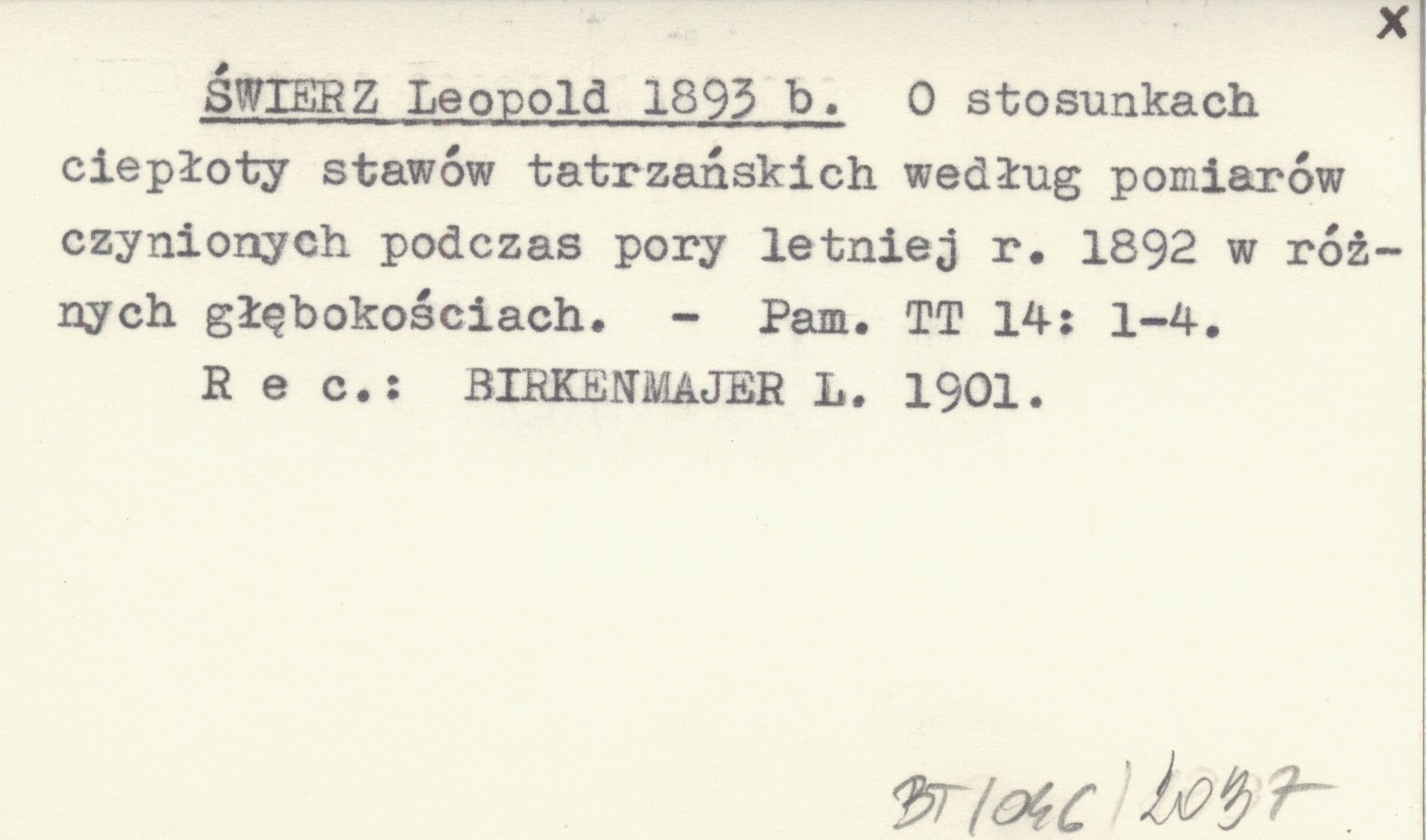 ŚWIERZ Leopold 1893 b O stosunkach ciepłoty stawów tatrzańskich według pomiarów czynionych podczas pory letniej r. 1892 w różnych głębokościach.