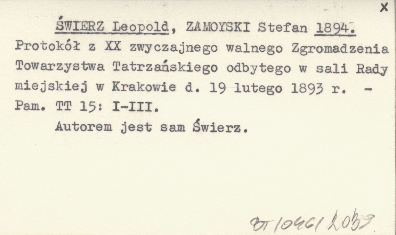 ŚWIERZ Leopold ZAMOYSKI, Stefan. ; 1894 Protokół z XX zwyczajnego walnego Zgromadzenia Towarzystwa Tatrzańskiego odbytego w sali Rady miejskiej w Krakowie d. 19 lutego 1893 r.