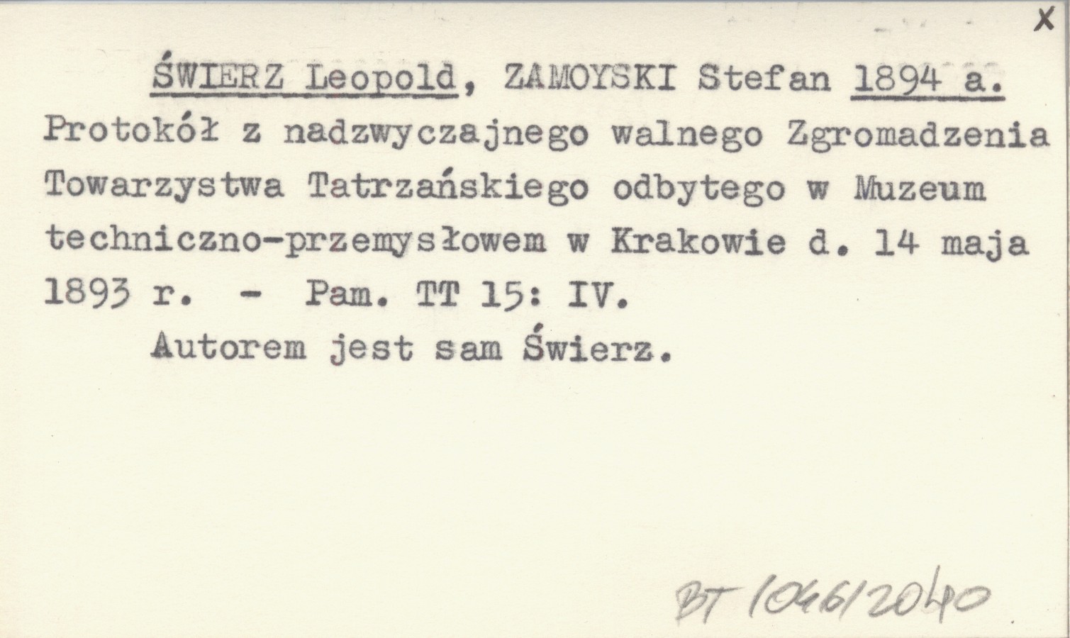 ŚWIERZ Leopold ZAMOYSKI, Stefan. ; 1894 a Protokół z nadzwyczajnego walnego Zgromadzenia Towarzystwa Tatrzańskiego odbytego w Muzeum techniczno-przemysłowem w Krakowie d. 14 maja 1893 r.