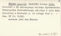 ŚWIERZ Leopold ZAMOYSKI, Stefan. ; 1894 Protokół z XX zwyczajnego walnego Zgromadzenia Towarzystwa Tatrzańskiego odbytego w sali Rady miejskiej w Krakowie d. 19 lutego 1893 r.