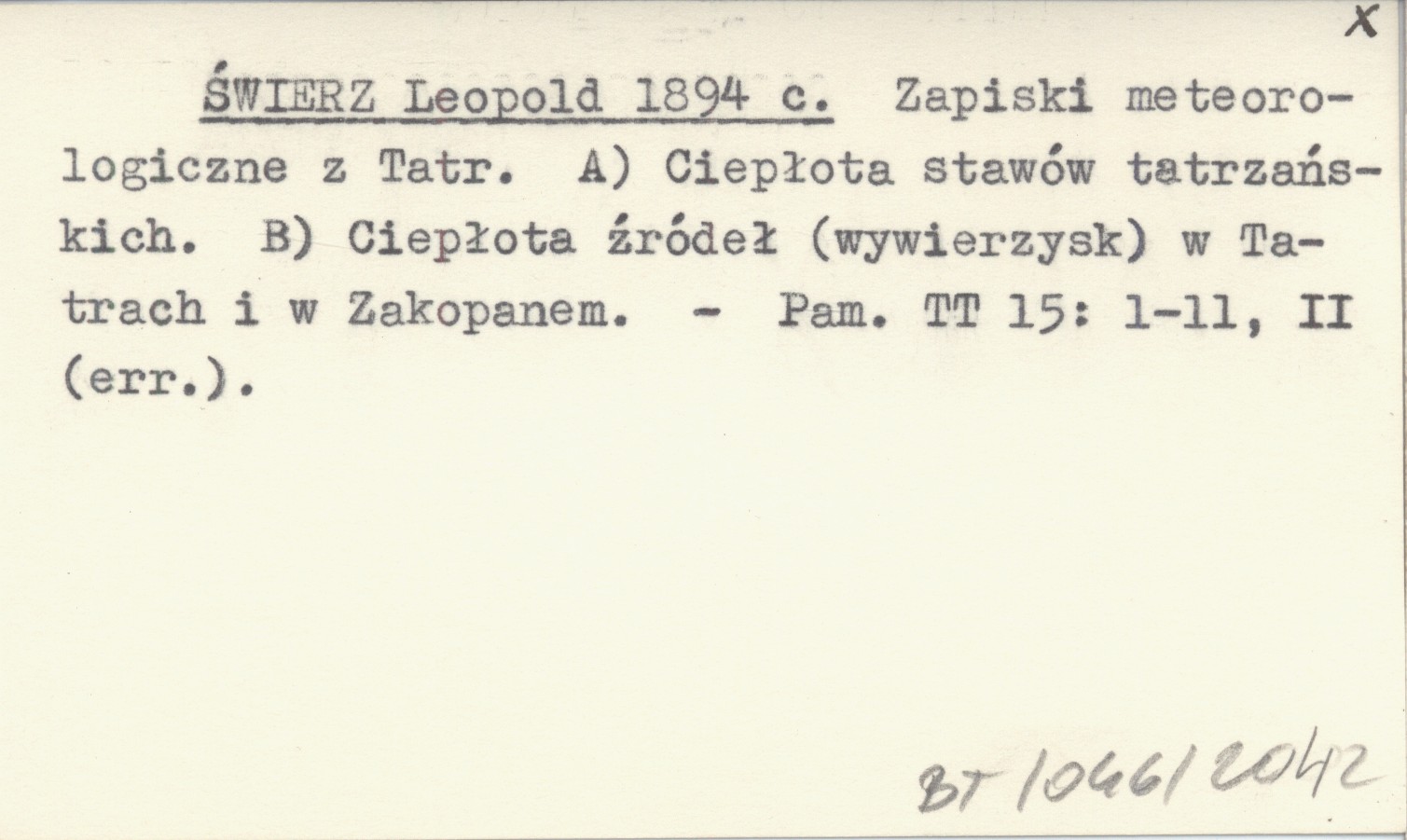 ŚWIERZ Leopold 1894 c Zapiski meteorologiczne z Tatr. A) Ciepłota stawów tatrzańskich. B) Ciepłota źródeł (wywierzysk) w Tatrach i w Zakopanem.