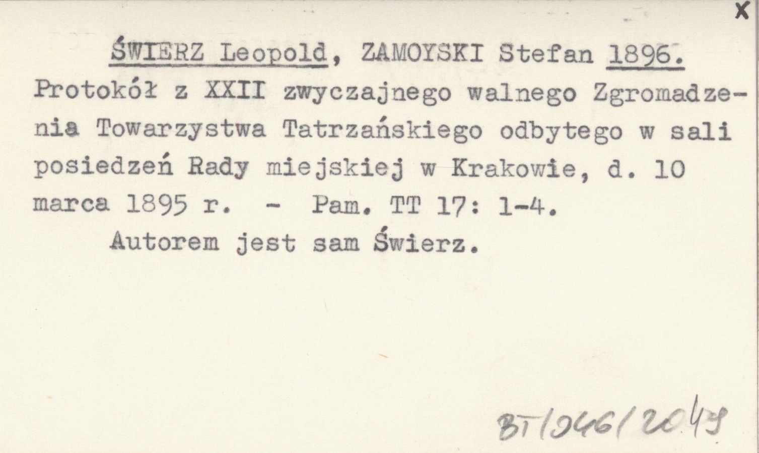 ŚWIERZ Leopold ZAMOYSKI, Stefan. ; 1896 Protokół z XXII zwyczajnego walnego Zgromadzenia Towarzystwa Tatrzańskiego odbytego w sali posiedzeń Rady miejskiej w Krakowie, d. 10 marca 1895 r.