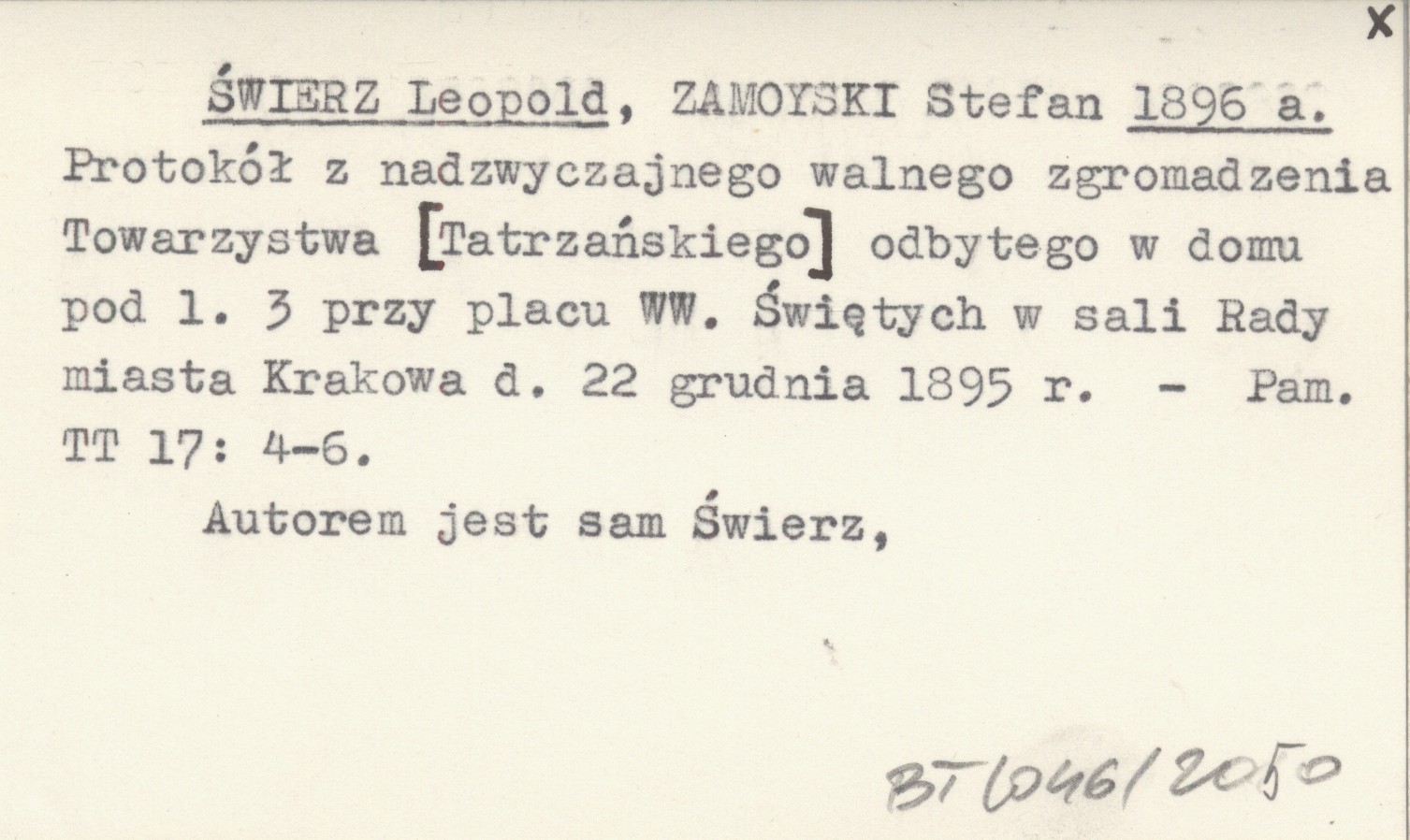ŚWIERZ Leopold ZAMOYSKI, Stefan. ; 1896 a Protokół z nadzwyczajnego walnego zgromadzenia Towarzystwa [Tatrzańskiego] odbytego w domu pod l. 3 przy placu WW. Świętych w sali Rady miasta Krakowa d. 22 grudnia 1895 r.