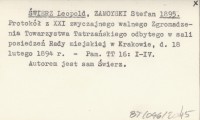 ŚWIERZ Leopold ZAMOYSKI, Stefan. ; 1895 Protokół z XXI zwyczajnego walnego Zgromadzenia Towarzystwa Tatrzańskiego odbytego w sali posiedzeń Rady miejskiej w Krakowie, d. 18 lutego 1894 r.