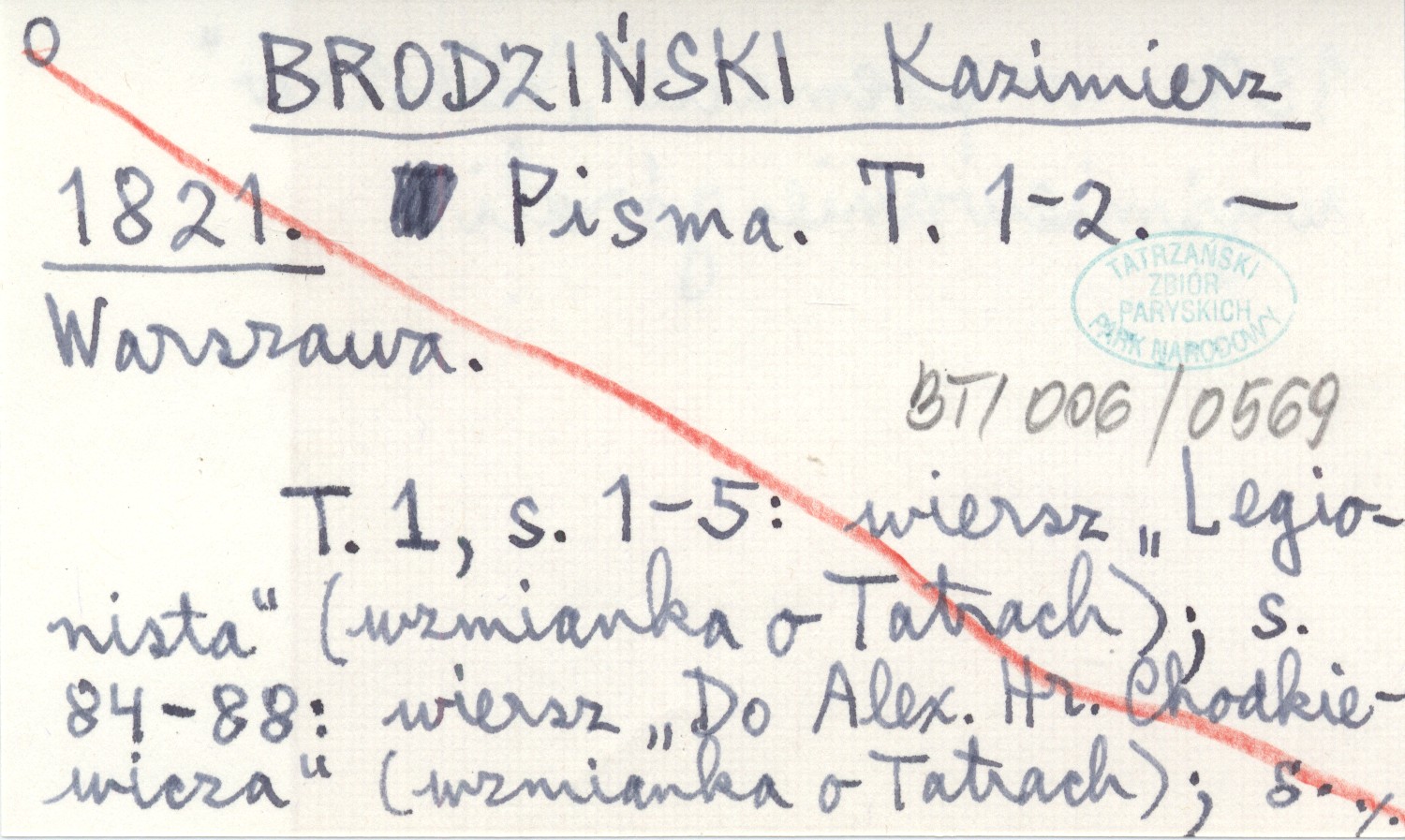 Warszawa , T. 1-2. T. 1, s. 1-5: wiersz "Legionista" (wzmianka o Tatrach) ; s. 84-88: wiersz "Do Alex. Hr. Chodkiewicza" (wzmianka o Tatrach) ; s. 139: w poemacie "Wiesław" wyśmiewanie górali.