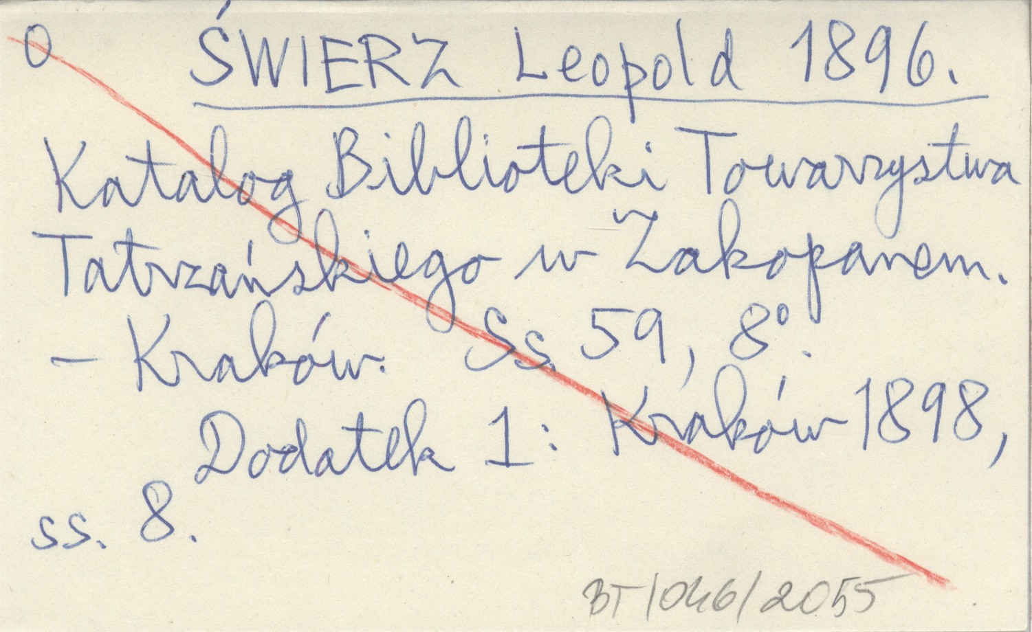 ŚWIERZ Leopold 1896 Katalog Biblioteki Towarzystwa Tatrzańskiego w Zakopanem.