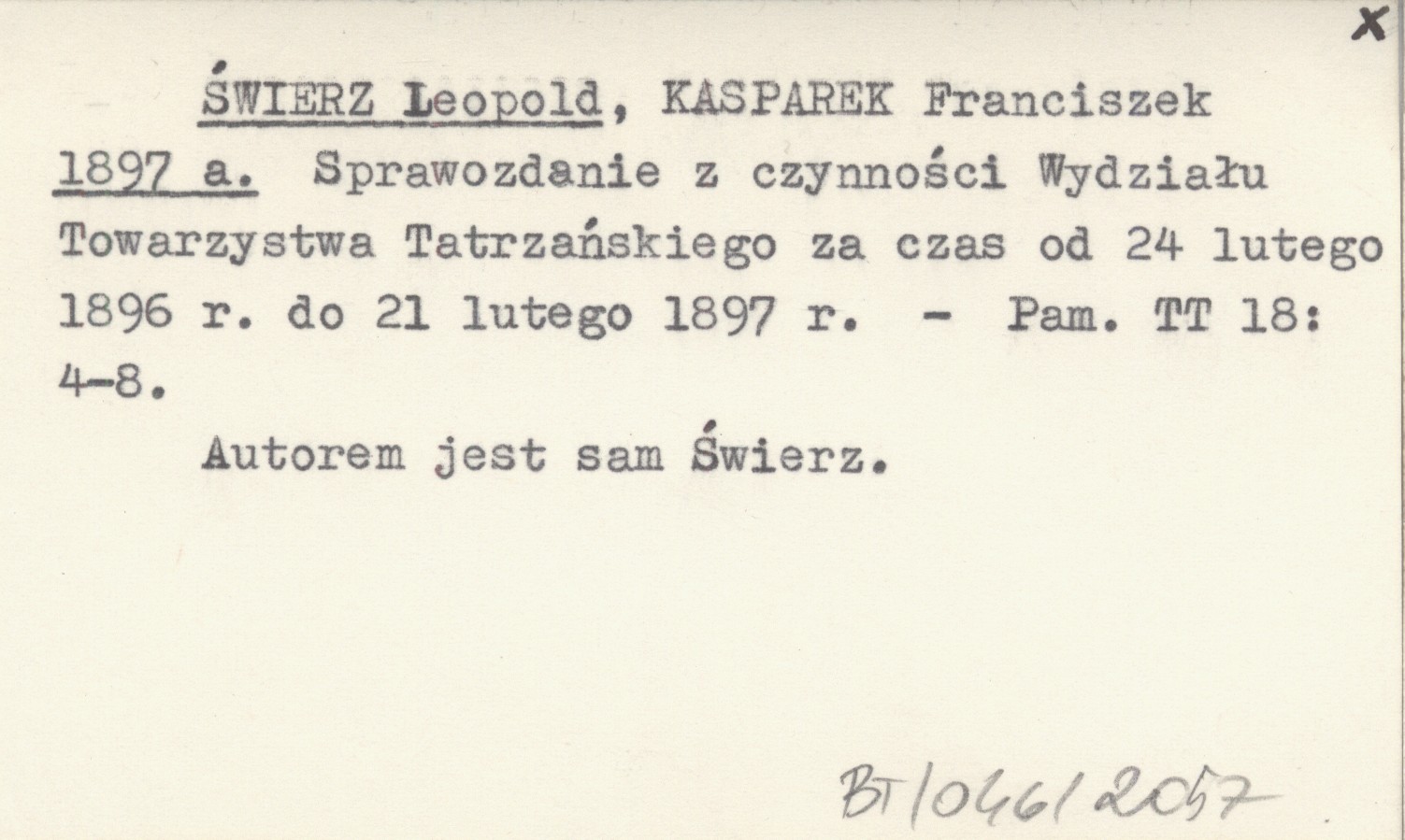 ŚWIERZ Leopold KASPEREK, Franciszek. ; 1897 a Sprawozdanie z czynności Wydziału Towarzystwa Tatrzańskiego za czas od 24 lutego 1896 r. do 21 lutego 1897 r.