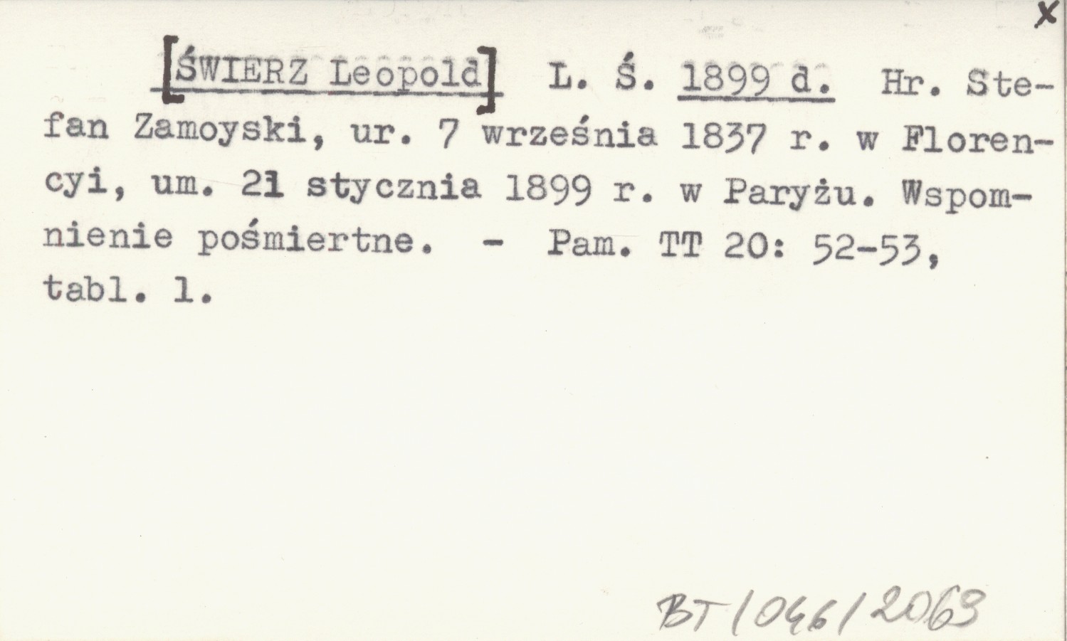 L. Ś. [ŚWIERZ Leopold] 1899 d Hr. Stefan Zamoyski, ur. 7 września 1837 r. w Florencyi, um. 21 stycznia 1899 r. w Paryżu. Wspomnienie pośmiertne.