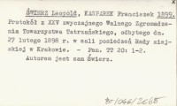 ŚWIERZ Leopold KASPEREK, Franciszek. ; 1899 Protokół z XXV zwyczajnego walnego Zgromadzenia Towarzystwa Tatrzańskiego, odbytego dn. 27 lutego 1898 r. w sali posiedzeń Rady miejskiej w Krakowie.