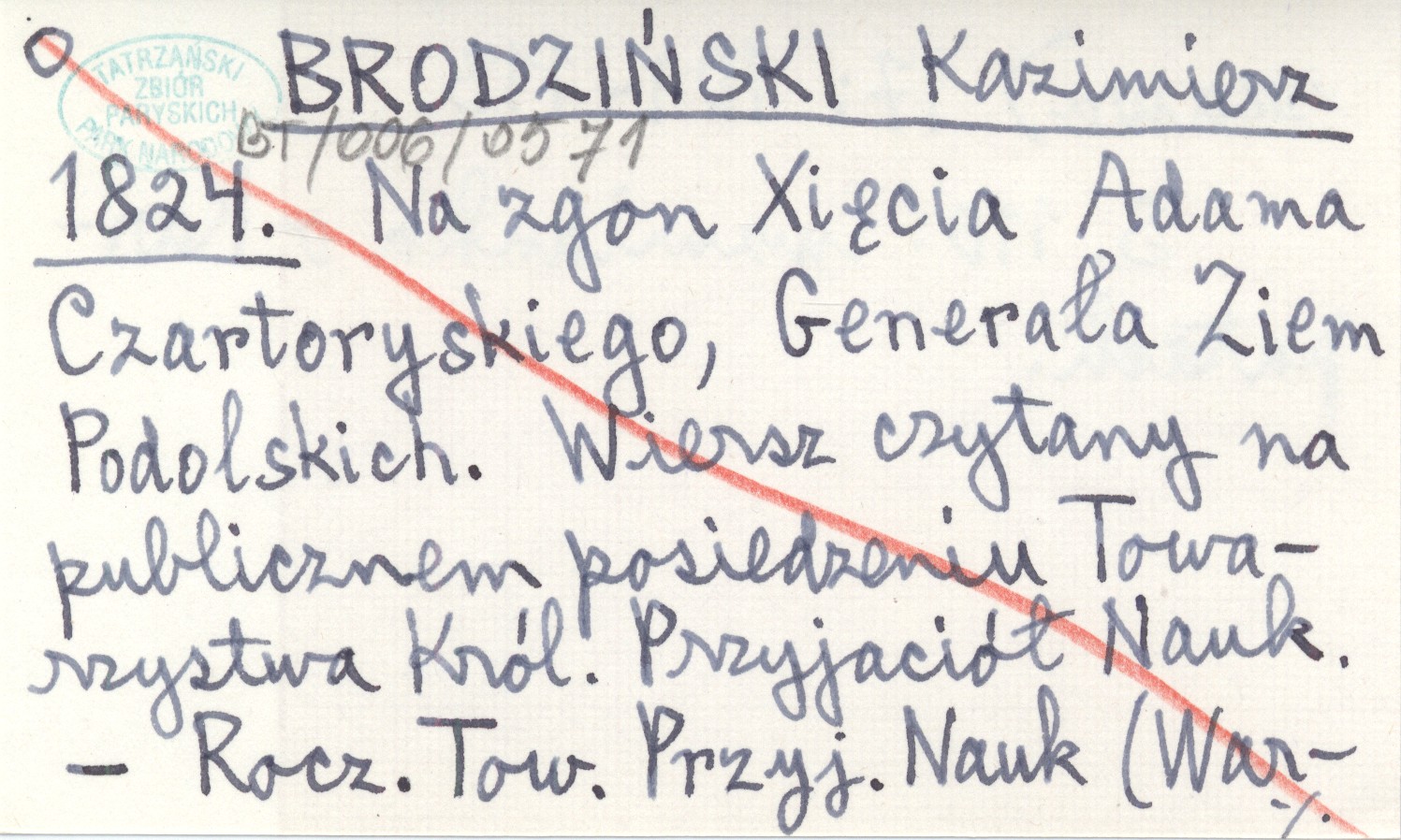 BRODZIŃSKI Kazimierz 1824 Na zgon Xięcia Adama Czartoryskiego, Generała Ziem Podolskich. Wiersz czytany na publicznem posiedzeniu Towarzystwa Królewskiego Przyjaciół Nauk.