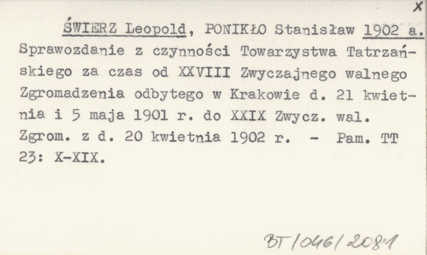 ŚWIERZ Leopold PONIKŁO, Stanisław. ; 1902 a Sprawozdanie z czynności Towarzystwa Tatrzańskiego za czas od XXVIII Zwyczajnego walnego Zgromadzenia odbytego w Krakowie d. 21 kwietnia i 5 maja 1901 r. do XXIX Zwycz. wal. Zgrom. z d. 20 kwietnia 1902 r.