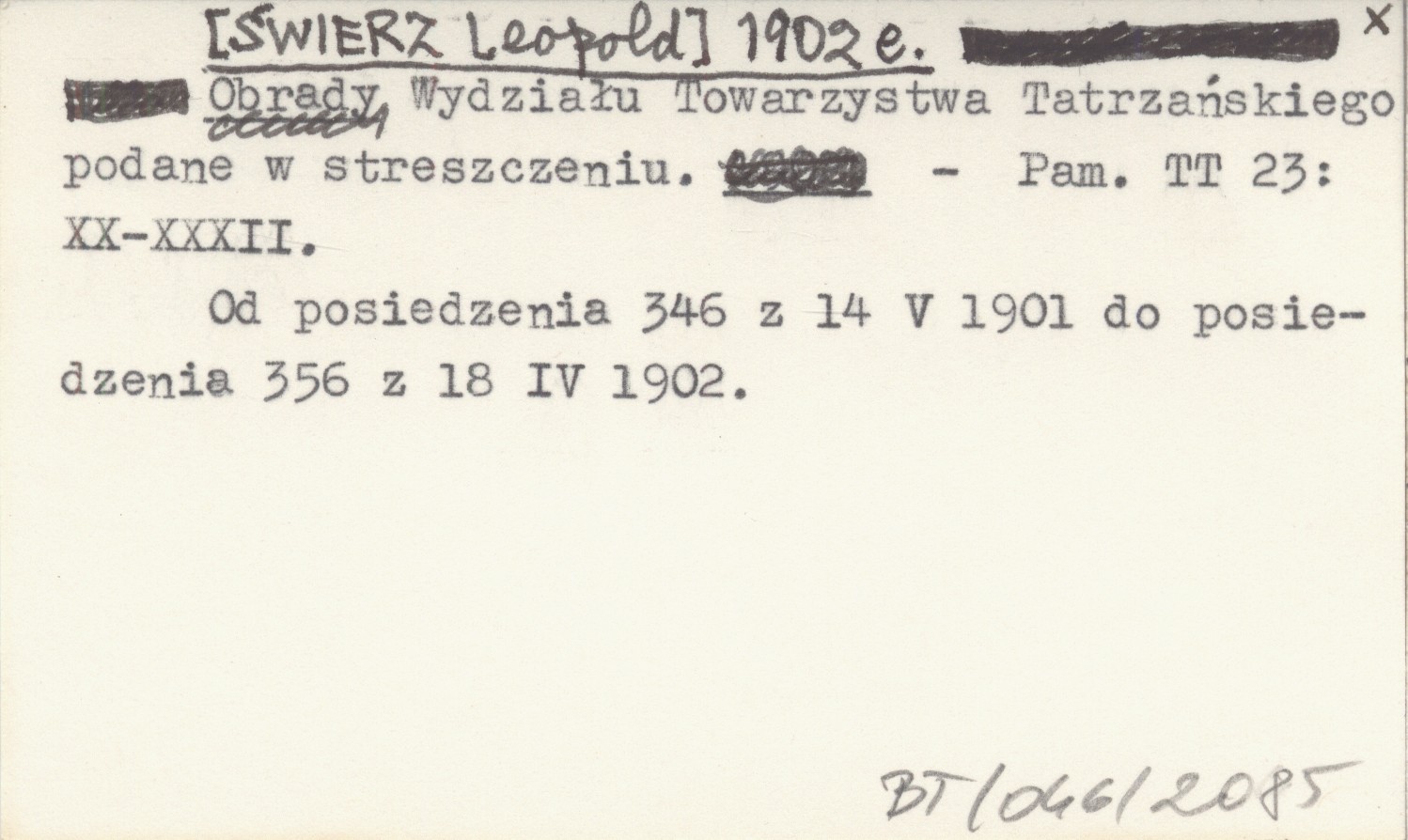 [ŚWIERZ Leopold] 1902 e Obrady Wydziału Towarzystwa Tatrzańskiego podane w streszczeniu.