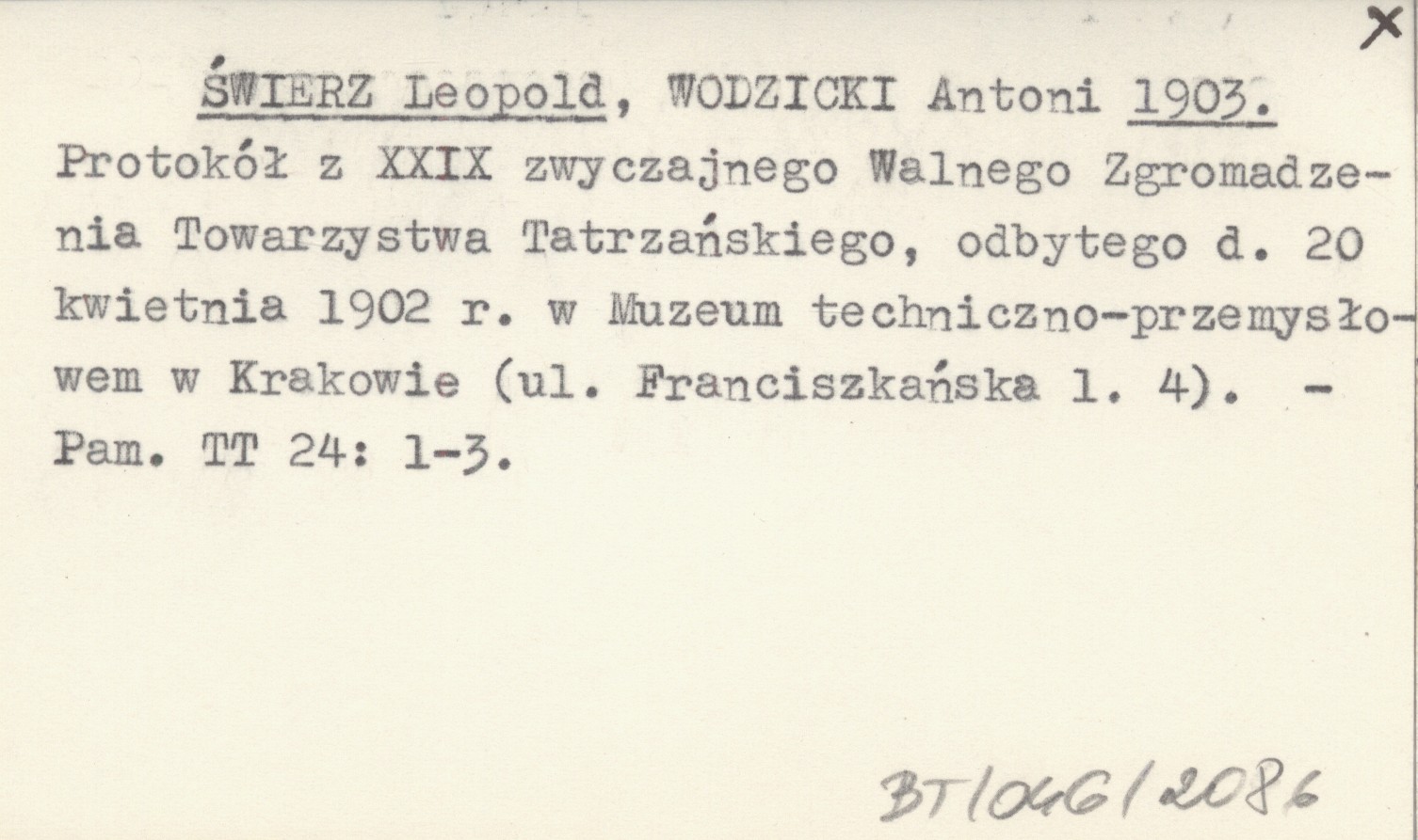 ŚWIERZ Leopold WODZICKI, Antoni. ; 1903 Protokół z XXIX zwyczajnego Wwalnego Zgromadzenia Towarzystwa Tatrzańskiego, odbytego d. 20 kwietnia 1902 r. w Muzeum techniczno-przemysłowem w Krakowie (ul. Franciszkańska l. 4).
