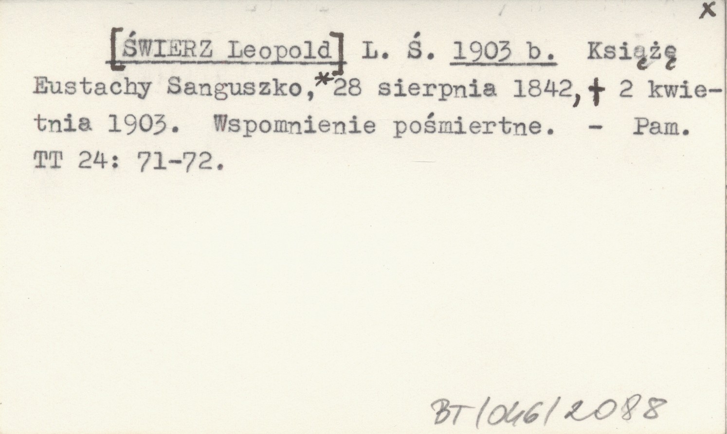 L. Ś. [ŚWIERZ Leopold] 1903 b Książę Eustachy Sanguszko, *28 sierpnia 1842, +2 kwietnia 1903. Wspomnienie pośmiertne.