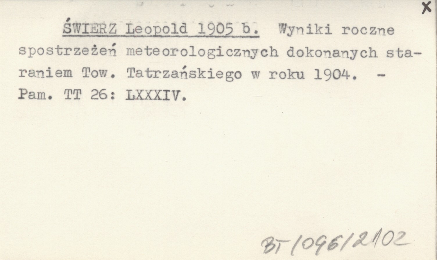 ŚWIERZ Leopold 1905 b Wyniki roczne spostrzeżeń meteorologicznych dokonanych staraniem Tow. Tatrzańskiego w roku 1904.