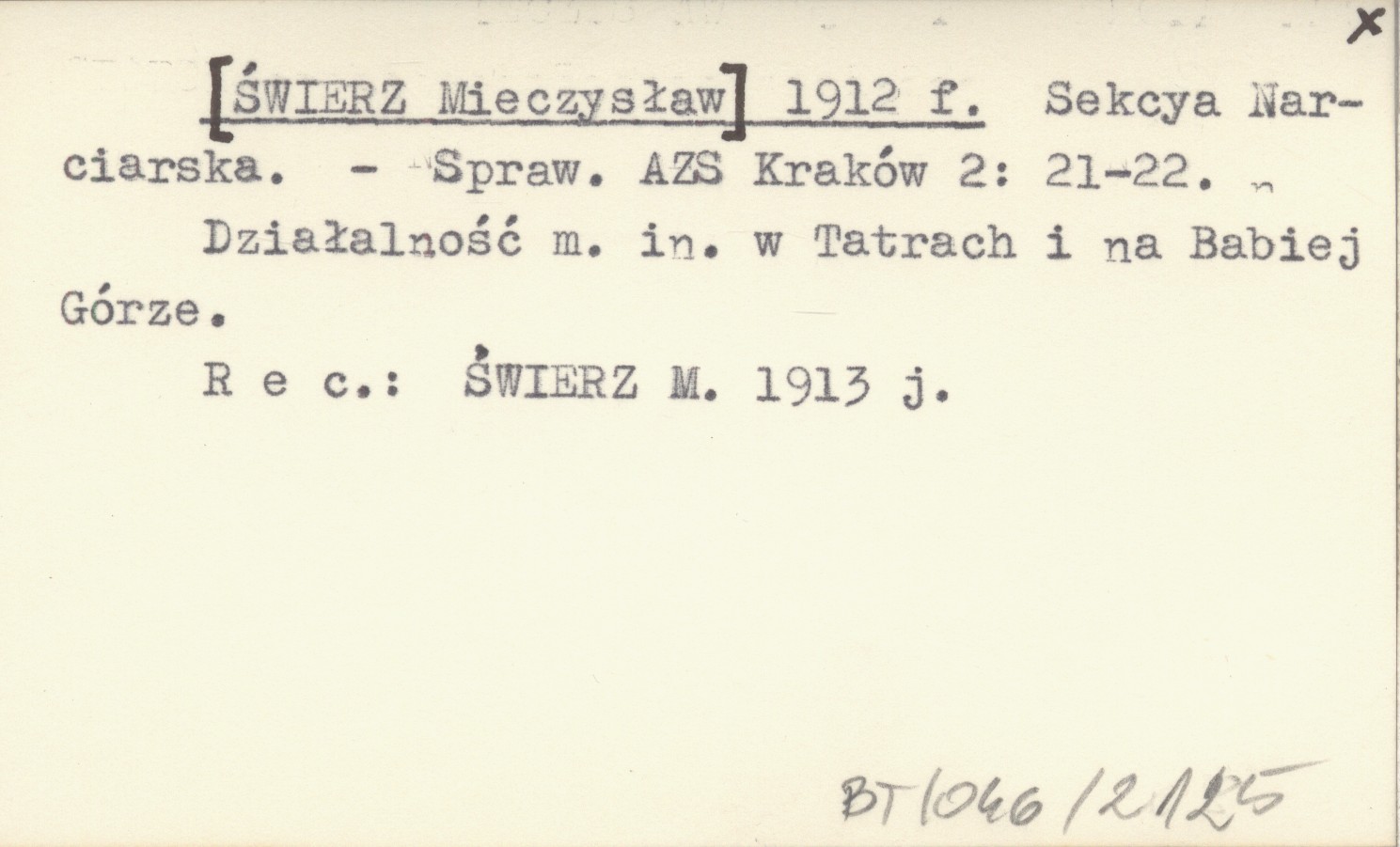 Sprawozdanie Akademickiego Związku Sportowego (Kraków) , 2: 21-22. Działalność m. in. w Tatrach i na Babiej Górze. REC: ŚWIERZ M. 1913 j