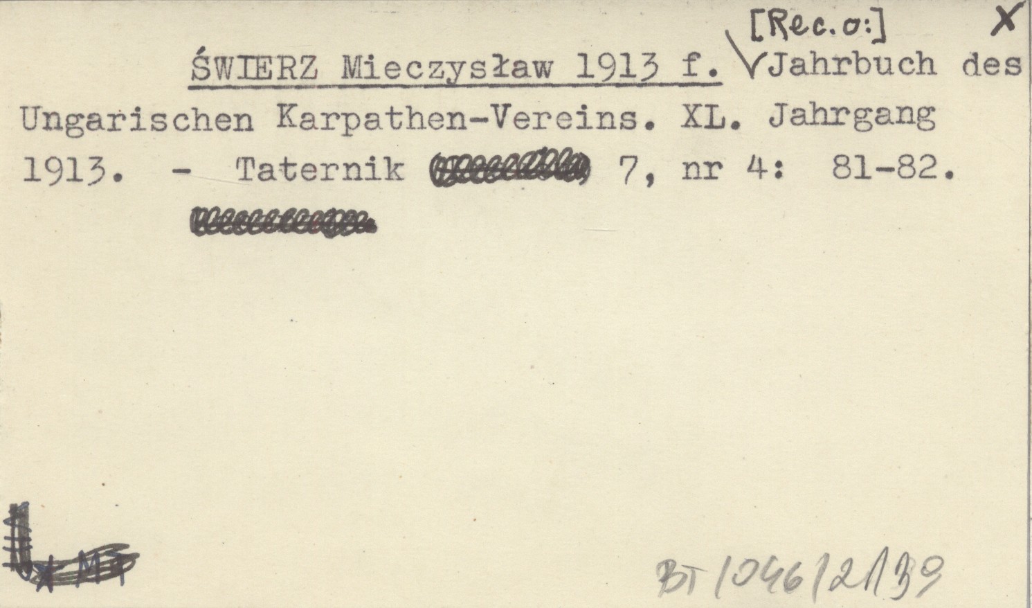 ŚWIERZ Mieczysław 1913 f [Rec. o:] Jahrbuch des Ungarischen Karpathen-Vereines. XL. Jahrgang 1913.