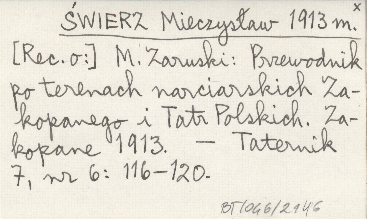 ŚWIERZ Mieczysław 1913 m [Rec. o:] M. Zaruski: Przewodnik po terenach narciarskich Zakopanego i Tatr Polskich. Zakopane 1913.