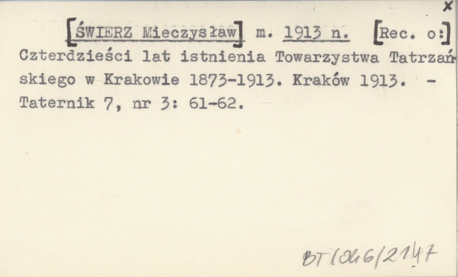 m. [ŚWIERZ Mieczysław] 1913 n [Rec. o:] Czterdzieści lat istnienia Towarzystwa Tatrzańskiego w Krakowie 1873-1913. Kraków 1913.