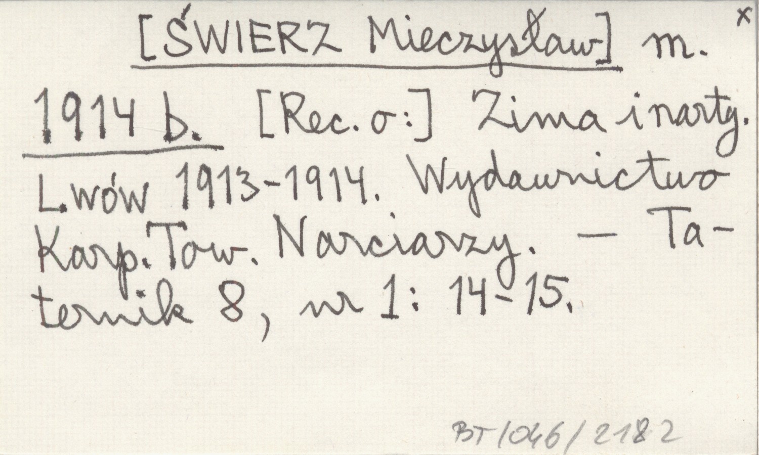 m. [ŚWIERZ Mieczysław] 1914 b [Rec. o:] Zima i narty. Lwów 1913-1914. Wydawnictwo Karpackiego Towarzystwa Narciarzy.