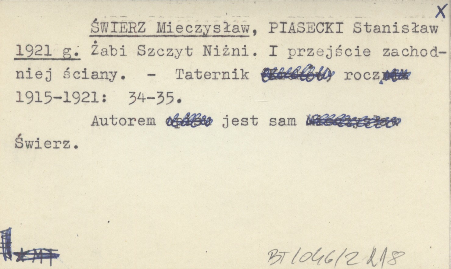 ŚWIERZ Mieczysław PIASECKI, Stanisław. ; 1921 g Żabi Szczyt Niżni. I przejście zachodniej ściany.