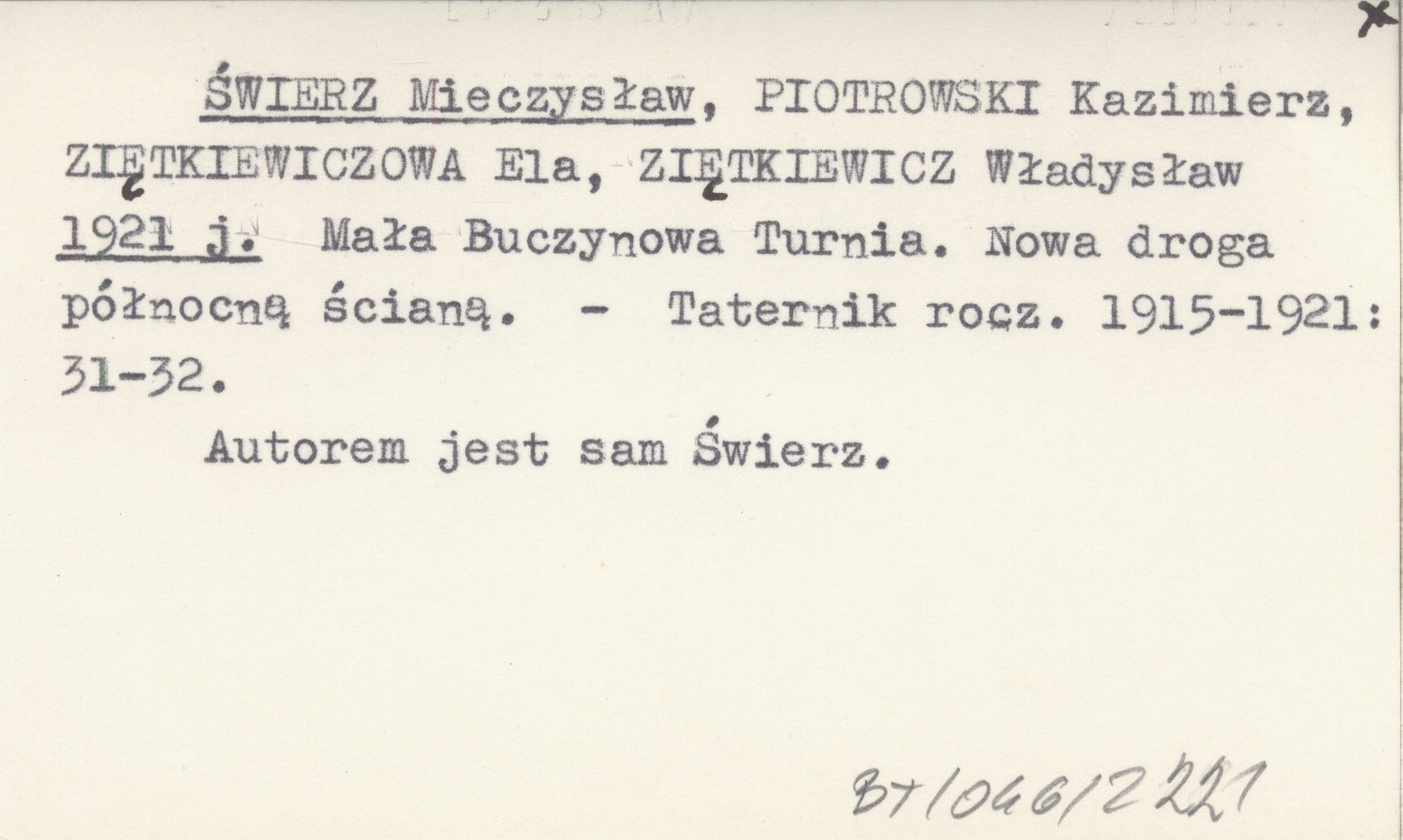 ŚWIERZ Mieczysław PIOTROWSKI, Kazimierz. ; ZIĘTKIEWICZOWA, Ela. ; ZIĘTKIEWICZ, Władysław. ; 1921 j Mała Buczynowa Turnia. Nowa droga północną ścianą.
