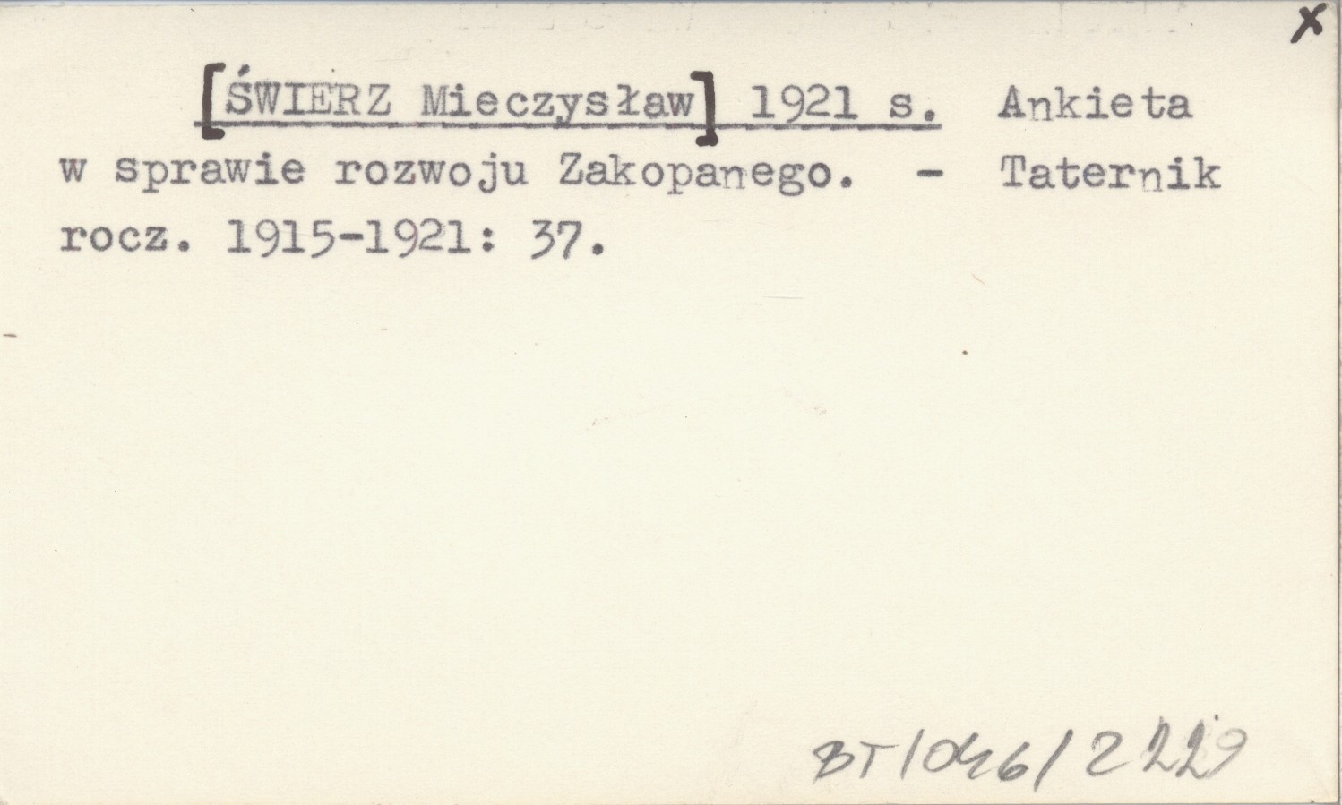 [ŚWIERZ Mieczysław] 1921 s Ankieta w sprawie rozwoju Zakopanego.