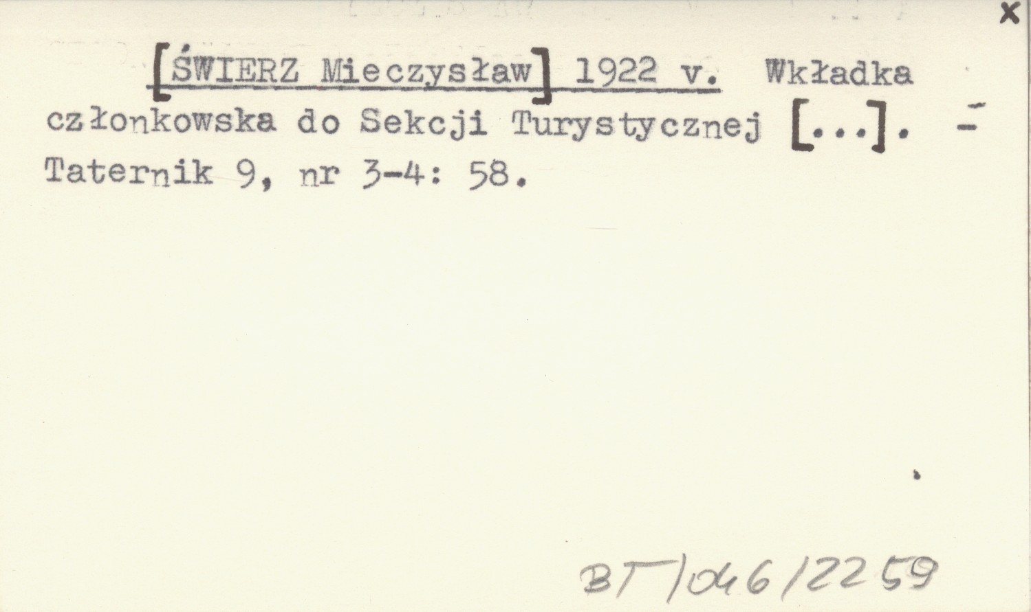 [ŚWIERZ Mieczysław] 1922 v Wkładka członkowska do Sekcji Turystycznej [...].