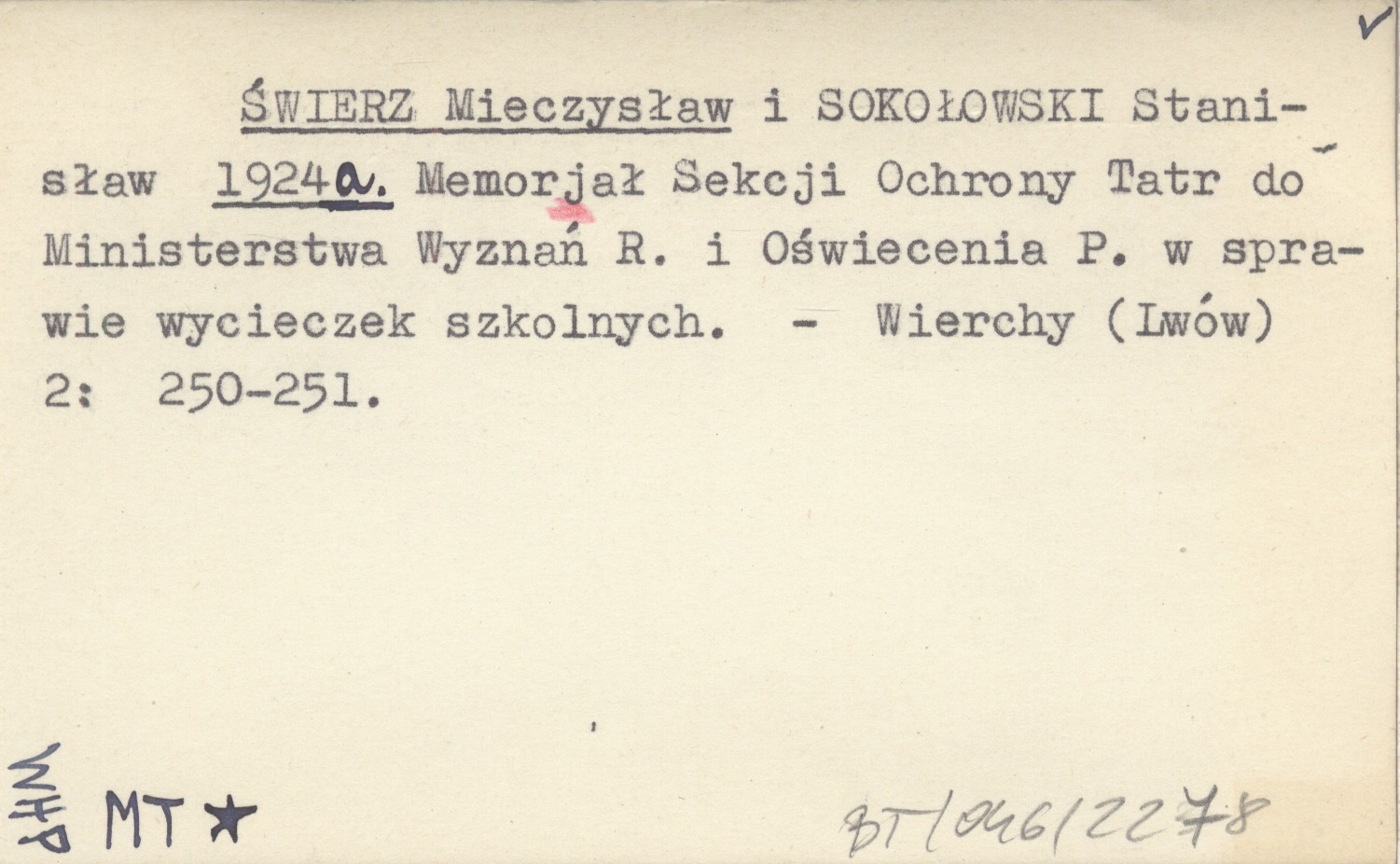 ŚWIERZ Mieczysław SOKOŁOWSKI, Stanisław. ; 1924 a Memorjał Sekcji Ochrony Tatr do Ministerstwa Wyznań R. i Oświecenia P. w sprawie wycieczek szkolnych.