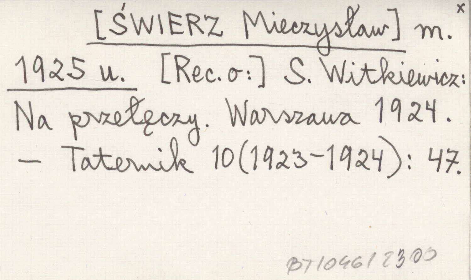 m. [ŚWIERZ Mieczysław] 1925 u [Rec. o:] S. Witkiewicz: Na przełęczy. Warszawa 1924.