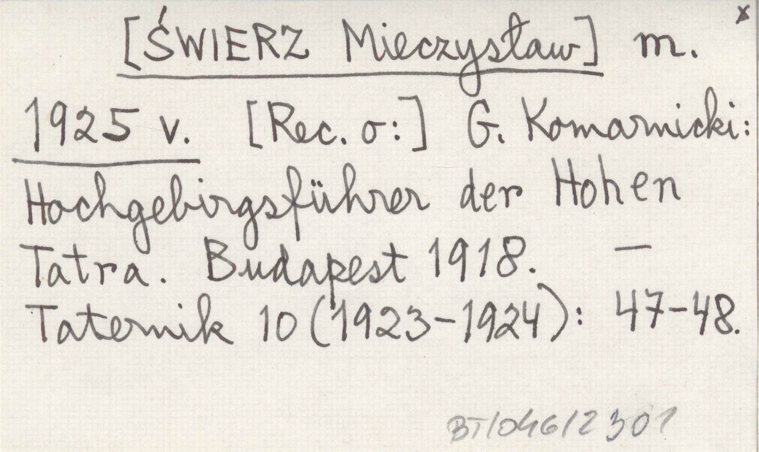 m. [ŚWIERZ Mieczysław] 1925 v [Rec. o:] G. Komornicki: Hochgebirgsführer der Hohen Tatra. Budapest 1918.