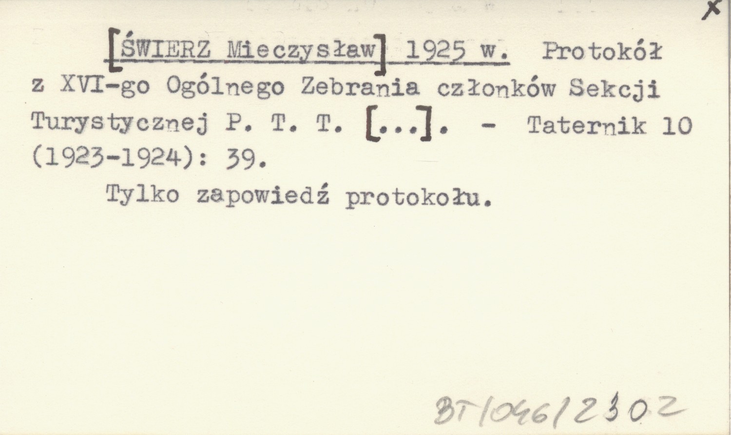 [ŚWIERZ Mieczysław] 1925 w Protokół z XVI-go Ogólnego Zebrania członków Sekcji Turystycznej P.T.T. [...].