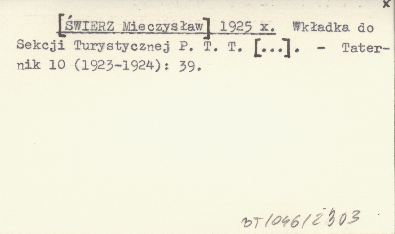 [ŚWIERZ Mieczysław] 1925 x Wkładka do Sekcji Turystycznej P.T.T. [...].