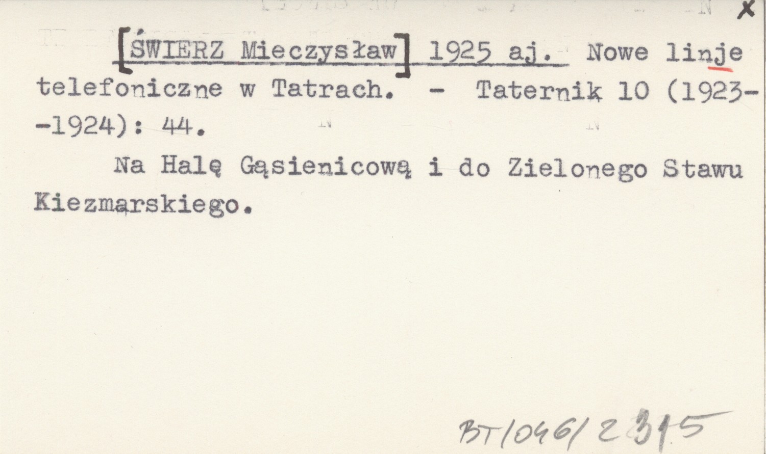 [ŚWIERZ Mieczysław] 1925 aj Nowe linje telefoniczne w Tatrach.