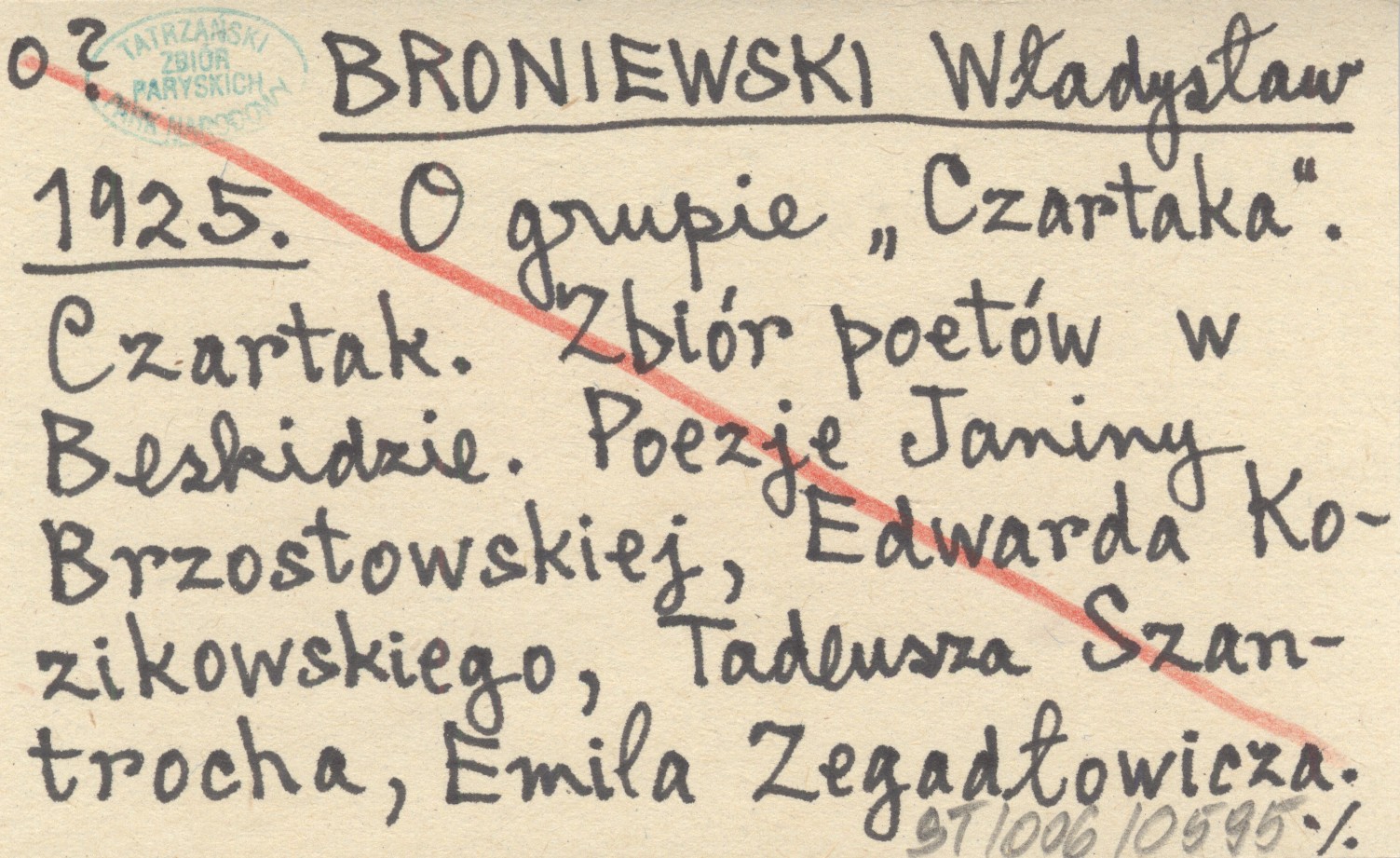 BRONIEWSKI Władysław 1925 O grupie "Czartaka". Czartak. Zbiór poetów w Beskidzie. Poezje Janiny Brzostowskiej, Edwarda Kozikowskiego, Tadeusza Szantrocha, Emila Zegadłowicza [...]. Warszawa, "Czartak", 1925.