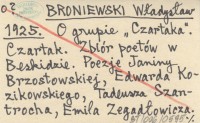 BRONIEWSKI Władysław 1925 O grupie "Czartaka". Czartak. Zbiór poetów w Beskidzie. Poezje Janiny Brzostowskiej, Edwarda Kozikowskiego, Tadeusza Szantrocha, Emila Zegadłowicza [...]. Warszawa, "Czartak", 1925.