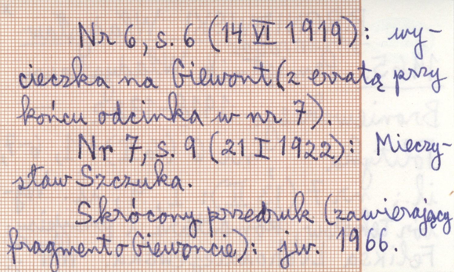 Polityka, Nr 6 (6 II): 1, 6-7, il. ; nr 7 (13 II): 1, 9, il. Wybór tekstów, komentarzy i przypisy: Feliksa Lichodziejewska. Nr 6, s. 6 (14 VI 1919): wycieczka na Giewont (z erratą przy końcu odcinka w nr 7). Nr 7, s. 9 (21 I 1922): Mieczysław Szczuka. Skrócony przedruk (zawierający fragment o giewoncie): jw. 1966.