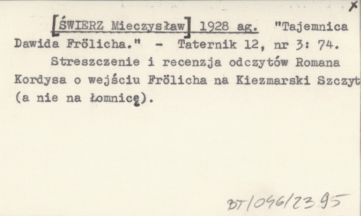 Taternik, 12, nr 3: 74. Streszczenie i recenzja odczytów Romana Kordysa o wejściu Frölicha na Kiezmarski Szczyt (a nie na Łomnicę).