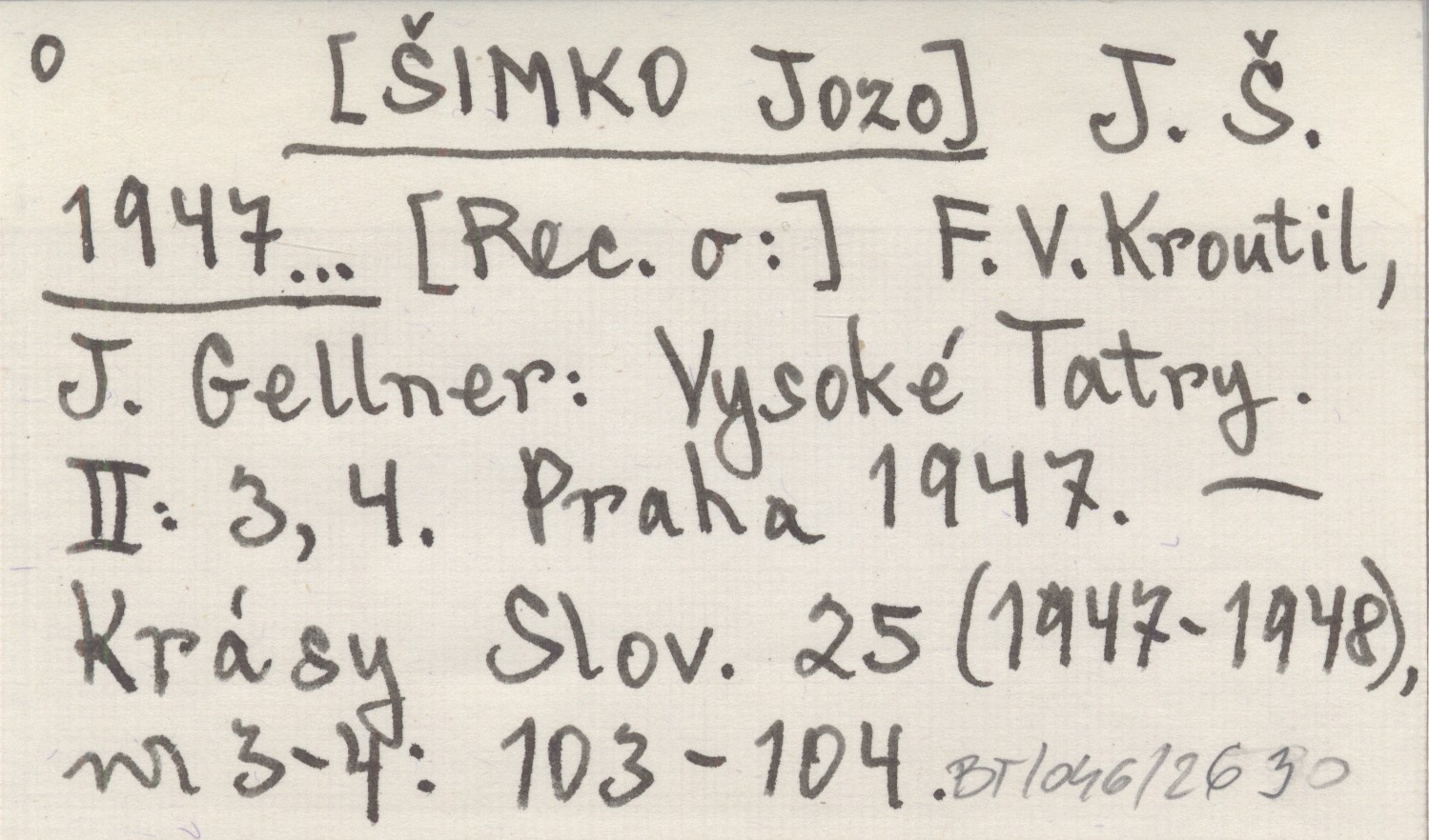 J. Š. [ŠIMKO Jožo] 1947... [Rec. o:] F. V. Kroutil, J. Gellner: Vysoké Tatry. II: 3, 4. Praha 1947.